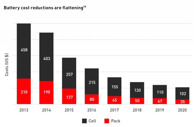 The battery pack is the most expensive component of the entire electric vehicle. According to BloombergNEF, the average cost was $137/kWh at the end of 2020. Although the estimates can vary, averaging 30% of the total cost of the vehicle, even moderate savings to this component would have a huge impact on the overall cost of the car manufacture and price. However, more recent analyses predict that the prices will start going up again due to the rapidly growing demand for EVs.