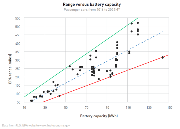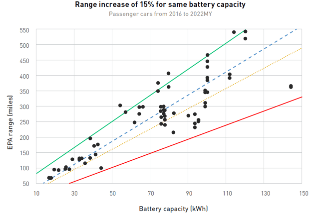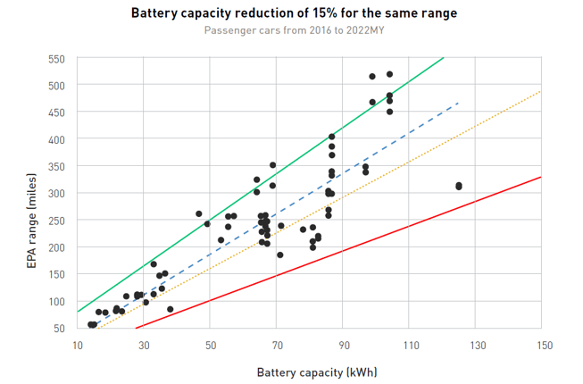 The less efficient large vehicles with big batteries are what’s dragging down the “average” line marked on the graph. Unfortunately for the end-users and the environment, large batteries tend to go in tandem with poorer system efficiencies. Engineers and manufacturers who must work with small batteries are forced to find ways to make them last longer and, therefore, look for solutions that make their cars more efficient. But makers of vehicles with larger batteries have less pressure or interest in investing in research and innovation that would make them more efficient since their costs are already very high and their range is long enough.